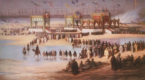 DIDASCALIA: Inaugurazione del Canale di Suez. Un'opera faraonica. Diminuì drasticamente la percorrenza tra l'Europa, l'Africa occidentale e l'Asia. L'umanità ne trasse immensi benefici. Ma fu anche acceleratore della fase apicale della colonizzazione e poi teatro di conflitti ancor in corso.